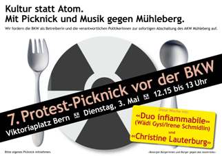Die Protestpicknicks gehen weiter. Das 7. Protestpicknick findet am 3. Mai statt und wird von Christine Lauterburg und dem Duo infiammabile unterstützt.