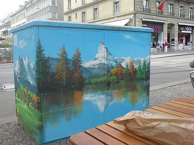 Glücklicherweise liegt dieser Bergsee nicht am Fusse vom Matterhorn, sondern mitten in Bern am Hirschengraben, so dass ich ihn heute beim Nachhausefahren geniessen konnte. Es handelt sich um ein Werk des tawainesischen Künstlers Jui-Chin Chiu, welcher 2013 im Rahmen einer Ausstellung des Alpinen Museums verschiedene Stromkästen in Bern bemalt hatte.